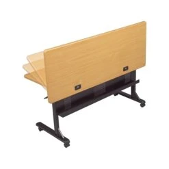 Create a temporary workspace with this flip-top table. The caster wheels let you move it with little effort, and the top flips vertically for convenient storage in tight spaces. The mahogany-finished laminate surface resists stains from spills, and the powder-coated steel frame on this MooreCo training table is strong enough to support 100 pounds of equipment and supplies.