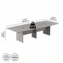 Bring your team together in a private or open-plan office with the Bush Furniture boat-shaped conference table. Perfect for medium to large groups, this meeting table provides ample room for eight to ten users to collaborate with laptops, paperwork, and other materials. A durable thermally fused laminate surface with continuous edge banding withstands everyday damage while a finished underside prevents snagged clothing. The tabletop also has two wire management grommets to accommodate a projector or a speakerphone. The conference room table is supported by a sturdy wooden base for a weight capacity of 200 lbs., making it great for use in a variety of professional and educational settings. This long office table is tested to meet ANSI/BIFMA standards for safety and performance and is backed by a lifetime manufacturer limited warranty. American-made with US and imported parts.