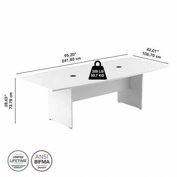 Bring your team together in a private or open-plan office with the Bush Furniture boat-shaped conference table. Perfect for medium to large groups, this meeting table provides ample room for six to eight users to collaborate with laptops, paperwork, and other materials. A durable thermally fused laminate surface with continuous edge banding withstands everyday damage while a finished underside prevents snagged clothing. The tabletop also has two wire management grommets to accommodate a projector and speakerphones. The conference room table is supported by a sturdy wooden base for a weight capacity of 200 lbs., making it great for use in a variety of professional and educational settings. This long office table is tested to meet ANSI/BIFMA standards for safety and performance and is backed by a lifetime manufacturer limited warranty. American-made with US and imported parts.