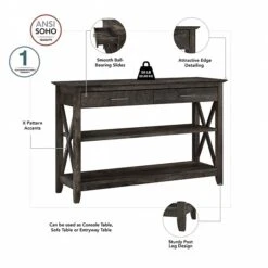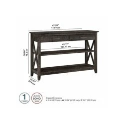 The Bush Furniture Key West console table with drawers and shelves is a perfect way to bring the feel of a coastal retreat to any living space. Stylish X-pattern accents and your choice of casual finishes present a look that works well in homes that embrace farmhouse styling. Box drawers organize household supplies while two shelves offer plenty of room for books, decorations, and more. The bottom shelf is fixed for stability, and the upper shelf can be adjusted to accommodate items of various sizes. The surface is great for displaying personal touches like plants, pictures, and other decor. Use the sofa table on its own, or combine it with coordinating Bush Furniture Key West products for a complete living room furniture set. This console table with storage has been tested to meet Bush Furniture’s standards for safety, performance, and durability and is backed by a 1-year manufacturer limited warranty.
