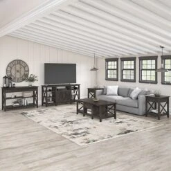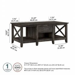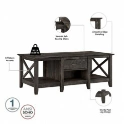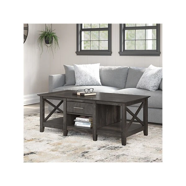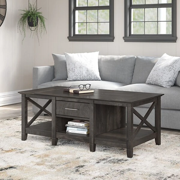 The Bush Furniture Key West coffee table with storage is a perfect way to bring the feel of a coastal retreat right to your living room. Stylish X-pattern accents on the side panels and your choice of casual finishes present a look that works well in homes that embrace cottage and farmhouse styling. A box drawer and lower cubby space in the center of the coffee table make it easy to organize books, magazines, and smaller items like TV remotes and writing utensils. Large open compartments on the right and left offer plenty of room for decorations or additional storage. Use the low coffee table on its own, or combine it with coordinating Bush Furniture Key West products for a complete living room furniture set. This coffee table with drawers and shelves has been rigorously tested to meet Bush Furniture’s standards for safety, performance, and durability and is backed by a 1-year manufacturer limited warranty.