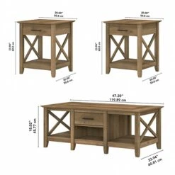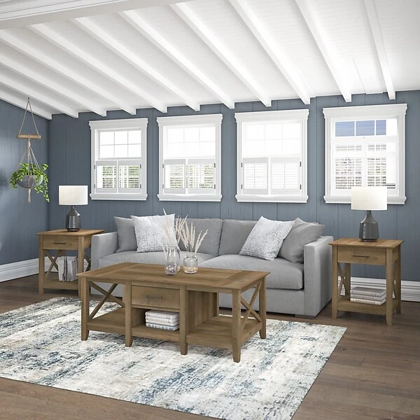 The Bush Furniture Key West coffee table with a set of two end tables is a perfect way to bring the feel of a coastal retreat right to your living room. Highlighted by X-shaped accents and a casual finish, this table set is a natural fit in homes that embrace farmhouse styling. Each side of the low coffee table features a box drawer above an open cubby space for organizing books, magazines, and other household items. Larger compartments on the right and left offer plenty of room for decorations or additional storage. The side tables also include a drawer for TV remotes, writing utensils, and more. A lower shelf provides even more storage and display capacity while the surface supports a lamp, a plant, or pictures. This living room table set has been tested to meet Bush Furniture’s standards for safety, performance, and durability and is backed by a 1-year manufacturer warranty.