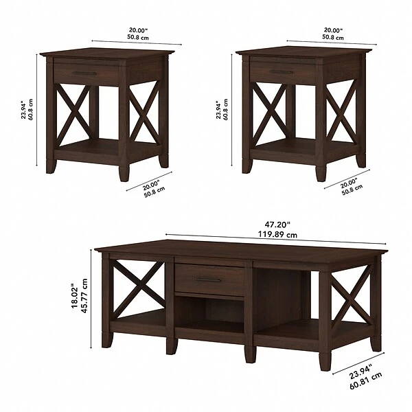 The Bush Furniture Key West coffee table with set of two end tables is a perfect way to bring the feel of a coastal retreat right to your living room. Highlighted by X-pattern accents and a casual finish, this table set is a natural fit in homes that embrace farmhouse styling. The low coffee table features a box drawer above an open cubby space for organizing books, magazines, and other household items. Larger compartments on the right and left offer plenty of room for decorations or additional storage. The side tables also include a drawer for TV remotes, writing utensils, and more. A lower shelf provides even more storage and display capacity while the surface supports a lamp, plant, or pictures. This living room table set has been tested to meet Bush Furniture standards for safety, performance, and durability and is backed by a 1-year manufacturer warranty.