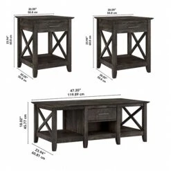 The Bush Furniture Key West coffee table with set of two end tables is a perfect way to bring the feel of a coastal retreat right to your living room. Highlighted by X-pattern accents and a casual finish, this table set is a natural fit in homes that embrace farmhouse styling. The center of the low coffee table features a box drawer above an open cubby space for organizing books, magazines, and other household items. Larger compartments on the right and left offer plenty of room for decorations or additional storage. Each of the side tables includes a drawer for TV remotes, writing utensils, and more. A lower shelf provides even more storage and display capacity while the surface supports a lamp, plant, or pictures. This living room table set has been tested to meet Bush Furniture’s standards for safety, performance, and durability and is backed by a 1-year manufacturer limited warranty.
