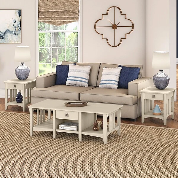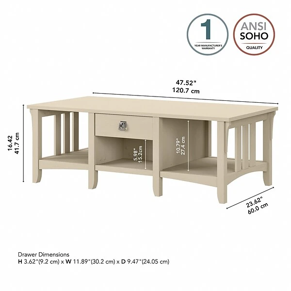 The Bush Furniture Salinas coffee table with storage offers a practical living room solution with a casual farmhouse style. An attractive and comfortable design that features plenty of room to organize everyday items makes this coffee table a perfect addition to your home. A box drawer and lower cubby space side make it easy to keep books, magazines, and smaller household items like TV remotes and writing utensils in order. Large open compartments on the right and left offer additional storage capacity or space to brighten up the room with plants and decorations. This farmhouse living room table has been rigorously tested to meet Bush Furniture’s standards for safety, performance, and durability and is backed by a 1-year manufacturer warranty.