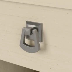 - Mission-inspired styling includes tapered legs, curved base rails, and decorative accents