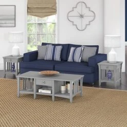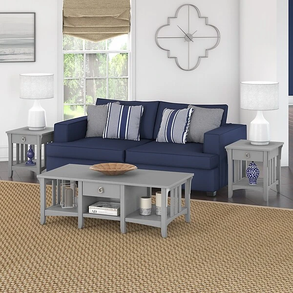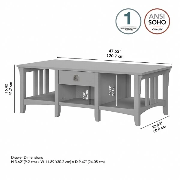 The Bush Furniture Salinas coffee table with storage offers a practical living room solution with a casual farmhouse style. An attractive and comfortable design that features plenty of room to organize everyday items makes this coffee table a perfect addition to your home. A box drawer and lower cubby space side make it easy to keep books, magazines, and smaller household items like TV remotes and writing utensils in order. Large open compartments on the right and left offer additional storage capacity or space to brighten up the room with plants and decorations. This farmhouse living room table has been rigorously tested to meet Bush Furniture’s standards for safety, performance, and durability and is backed by a 1-year manufacturer warranty.