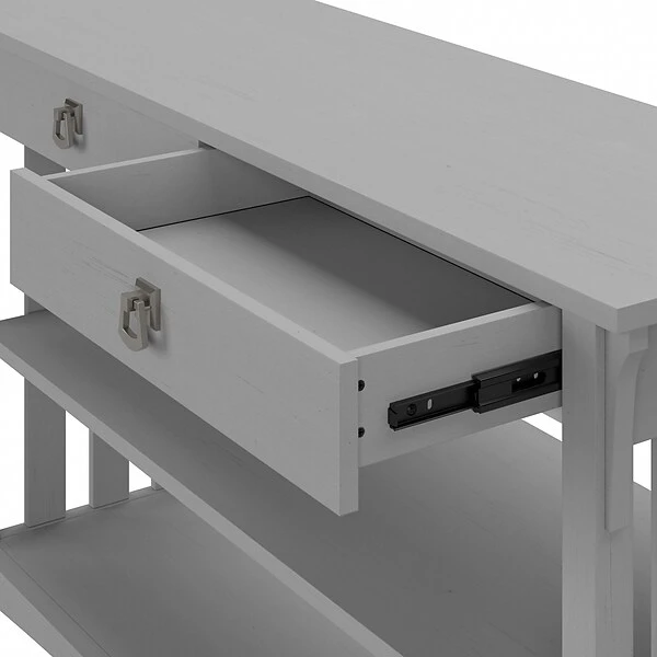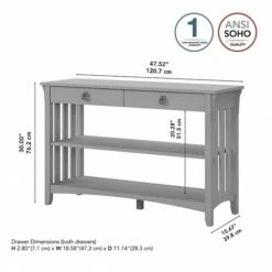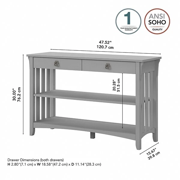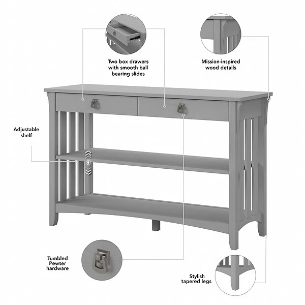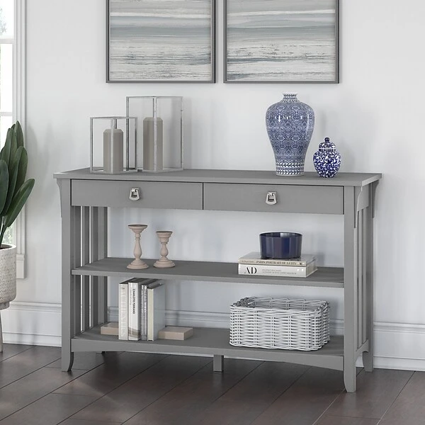 The Bush Furniture Salinas console table with drawers and shelves offers a practical home organization solution with a casual farmhouse style. A versatile and attractive design that features ample storage and display space makes for an ideal home office, living room, or entryway table. The box drawers organize miscellaneous household supplies while two shelves offer plenty of room for books, decorations, and more. The bottom shelf is fixed for stability, and the upper shelf can be raised or lowered to accommodate items of various sizes. The surface is an ideal place to brighten up the room with personal touches like plants, pictures, and another home decor. This farmhouse sofa table has been rigorously tested to meet Bush Furniture’s standards for safety, performance, and durability and is backed by a 1-year manufacturer warranty.