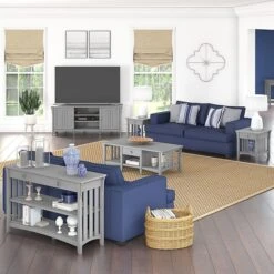 - Console table with drawers and shelves made of engineered wood in Cape Cod gray finish is perfect for any living space