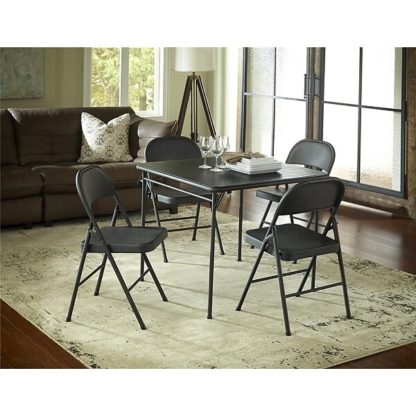 Unfold some fun with a versatile table designed for indoor or light outdoor use. Stylish, strong, and easy to clean, this multi-purpose piece saves space and time with a common fold leg design that folds flat for easy storage. Its 34″ square size offers comfortable seating for four. This table has a heavy duty steel frame with a scratch resistant, textured powder coated frame.