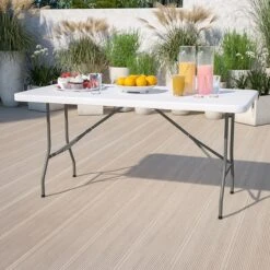 Extend your tabletop space with the 60-inch Flash Furniture Commercial Table as it features comfortably big desktop space. Made of plastic, it has a sturdy construction that is enhanced by its smooth granite white finish. This plastic commercial table has a rectangular design that coordinates with most decor themes and is ideal for areas with limited space. Available as a single table, it features durable tabletop with blow-molded edges to protect the top from accidental damage.