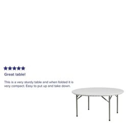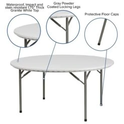 Add extra storage space to your office or home with the 60-inch Flash Furniture Commercial Table as it features an elegant and spacious design. It features a plastic tabletop with smooth granite white finish that makes it easy to clean and resistant to stains. This plastic commercial table with its round design is ideal for areas with limited space and lends a trendy look to the decor of your room or office. Available as a single table, it features durable tabletop with blow-molded edges to protect the top from accidental damage.