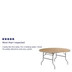Designed for restaurant settings, the 60-inch Flash Furniture Folding Banquet Table is a smart choice to expand your seating area. It features a wood tabletop with smooth quadruple coated polyurethane varnish that makes it strong and useful for daily use. This wood folding banquet table with its round design is ideal for areas with limited space and lends a trendy look to the decor of your room or office. Available as a single table, it features durable tabletop with aluminum edges to protect the top from accidental damage.