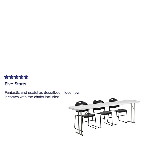 Use the 96-inch Flash Furniture Training Table Sets while giving training and presentations in your office or school. Made of plastic, it has a sturdy construction that is enhanced by its smooth granite white finish. These rectangular plastic training table sets complement most decor themes and fit well in smaller spaces. Available in a set of one white table and three black chairs, they come with a durable design for long-term usage.