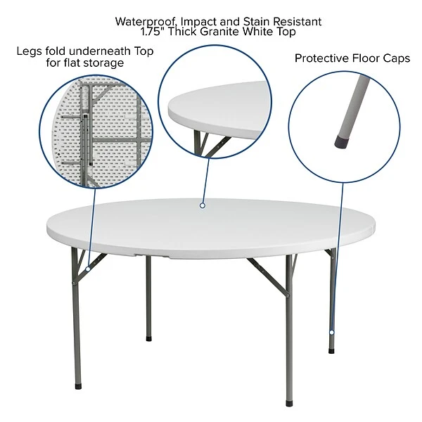 Give guests an opportunity to converse by placing them at this 60-inch table. Its smooth granite white top provides space for group games, crafts, and shared meals, and the locking legs keep the surface level and stable. Weighing only 52 pounds with folding legs, this Flash Furniture waterproof plastic table makes it easy to move the party outdoors.