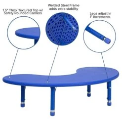 The durable table has a 220 pound static load capacity and features a 35″ x 65″ half-moon shaped top with rounded corners for safety and a welded, steel frame for increased stability. Adjustable height legs give you the flexibility to raise or lower the table a full 9″ in 1″ increments. Floor glides protect your floor by sliding smoothly when you need to move the table.