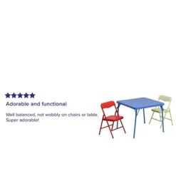 Comfortable and colorful, this Kids Colorful Folding Table and Chair Set is great set for home or school use. This set includes a folding table and two chairs that are suitable for toddlers. Thanks to a combination of vinyl, steel and metal, this set is durable, sturdy and easy to clean. It can be used either indoors or outdoors for arts and crafts, reading and eating. Children can enjoy a table of their own for eating, reading, creating and playing. The easy to clean vinyl padded table top is great for toddler use. The padded colorful folding chairs are lightweight so children can easily transport their own chair.