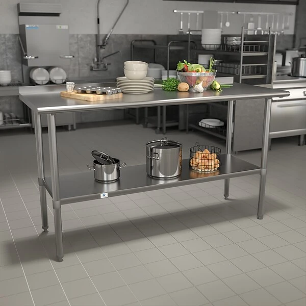 Give yourself some extra space for catering and increase functionality in your restaurant kitchen with this commercial kitchen prep and work table with adjustable undershelf. This steel commercial work table is a great space for bulk food preparation. This steel table can be placed against a wall or used as a freestanding kitchen island. This metal utility table resists corrosion and holds up to 600 lbs. while the undershelf holds up to 200 lbs. This commercial grade work table is certified to NSF quality standards. This stainless prep table can be used as a work surface in your garage. Rounded corners prevent scrapes and cuts and this work table assembles in under 10 minutes with the included tools. Adjustable feet move up to 1″ to keep you level. Remove any traces of food contaminants with water and a neutral detergent followed by a dry cloth.