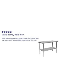 Give yourself some extra space for catering and increase functionality in your restaurant kitchen with this commercial kitchen prep and work table with adjustable undershelf. This steel commercial work table is a great space for bulk food preparation. This steel table can be placed against a wall or used as a freestanding kitchen island. This metal utility table resists corrosion and holds up to 600 lbs. while the undershelf holds up to 200 lbs. This commercial grade work table is certified to NSF quality standards. This stainless prep table can be used as a work surface in your garage. Rounded corners prevent scrapes and cuts and this work table assembles in under 10 minutes with the included tools. Adjustable feet move up to 1″ to keep you level. Remove any traces of food contaminants with water and a neutral detergent followed by a dry cloth.