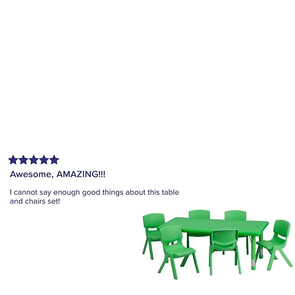The durable table features a 24″ x 48″ rectangular top with rounded corners for safety and a welded, steel frame for increased stability. Adjustable height legs give you the flexibility to raise or lower the table a full 9″. The lightweight stack chairs are contoured for comfort, have a 10.5″ seat height and can be stacked up to 10 high. Floor glides protect your floor by sliding smoothly when you need to move the set.