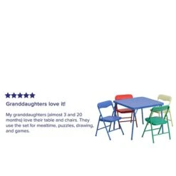 The Kids Folding Table and Chair Set is kid sized to give toddlers and small children their own special table and chairs. Four metal folding chairs (Blue, Green, Red and Yellow), with upholstered seats and backs that match the frame color and complement the folding table. The table has a padded, blue vinyl cover that makes clean up time a breeze. A powder coated finish on the table and chair legs protects them from scratches. Plastic floor glides protect your floor by sliding smoothly when you need to move the set. This set can be used indoors or outside and is easy to fold up, transport and store. This folding table and chair set gives your little ones a comfortable place to play, color and eat at family gatherings.