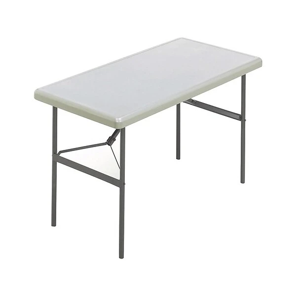 Quickly add extra seating to your office or facility with this sturdy folding table. The high-density polyethylene top is easy to clean and resists both scratches and dents. Round tubing legs provide strength and stability while folding neatly into protective channels when the table is stored. With a 300-pound capacity, this Iceberg 4-foot folding table handles office paperwork or extra equipment with ease.