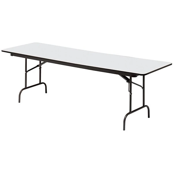 - Folding tables feature a wear-resistant, 3/4″ top surface; laminated melamine over particle board with a melamine-sealed underside and bull-nose vinyl T-mold edging