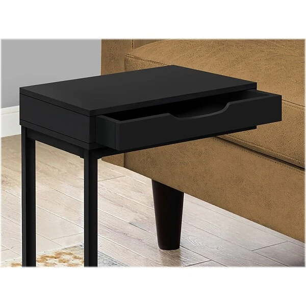 Tired of holding a beverage in your hand and a bowl of popcorn in your lap while binge-watching? This Monarch Specialties Inc. C-table keeps them within easy reach so you can sit back and enjoy the show. The C-shaped base slides under your sofa or chair, placing the table surface close to you. For added convenience, the top includes a storage drawer that is accessible from both sides. Use it to hide away mobile devices to avoid interruptions while you’re watching TV, then store remotes in it when you’re done. Stylish and versatile, this portable accent table features a top in a smooth, black finish and a metal frame in black that adds a modern look wherever you need a small side table with storage.