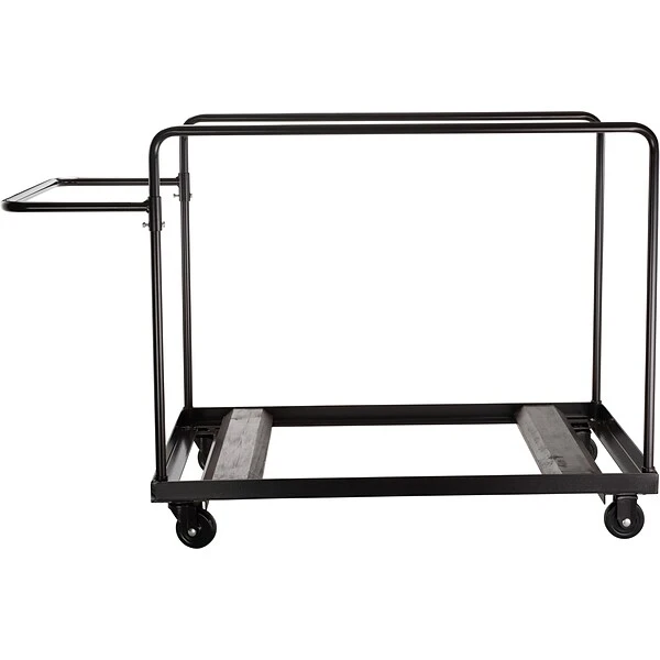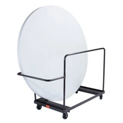 The DY-71R Dolly stores and moves round folding tables with ease. Stack up to 10 vertically upright 71″ roundtables on this sturdy, tubular steel dolly. The brown scratch-resistant powder-coated paint finish resists chipping even after years of rigorous use. This dolly has two handles, one front handle and four hard rubber casters (two that swivel) for easy maneuvering. Each caster boasts a 165 lb. weight capacity for a total of 660 lbs. Meets “MAS Certified Green” environmental industrial requirements.