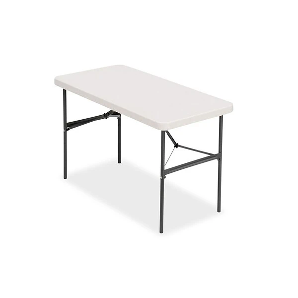 Make your next event a success with this light, easily moveable 4-foot folding table. Ideal for events such as banquets and conferences, this portable table accommodates up to four people, and the lightweight design and folding metal legs make setup easy. The 2-inch thick scratch- and stain-resistant resin polyethylene surface ensures lasting durability, while the rugged frame offers reliable stability and lets this table support up to 500 pounds. This folding table offers ample surface space to accommodate large amounts of food, merchandise and literature.