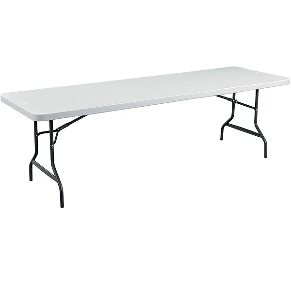Expand your available work, dining or meeting accommodations with this folding table. The 8-foot length provides comfortable seating for up to eight people, and the durable polyethylene resin tabletop withstands scratches, scuffs and stains for enduring quality. Featuring a neutral color scheme, this table offers a professional look with or without a tablecloth. A sturdy metal frame with integrated supports provides added strength and stability. With its folding design, this 8-foot table is easy to store in between uses.