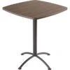 - Cherry table top made of melamine laminate with black T-mold edge and black steel X-shaped base