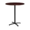 - 42-inch round table with modern chrome post legs- a sleek alternative to pedestal bases