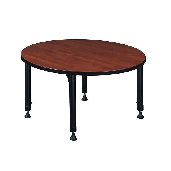 Give everyone more room with Kee tables. Kee adjustable post legs come four to a set and are height adjustable to accommodate students of all ages. Height is easy for adults to adjust by loosening and tightening a bolt with the included hex key. This 42-inch Round classroom table assembles in a snap with just a few screws. The table is constructed of a thermal fused melamine Cherry laminate tabletop that is 1-inch thick and finished with a black T-Mold edge band. Laminates are scratch, stain and scald resistant and wipe clean easily. Rounded corners make the table safer for everyone. A sleek alternative to pedestal style bases, the adjustable post legs come in a classic black with chrome underneath. Adjustable glides on the bottom of the base ensure a level tabletop and are easy to adjust.
