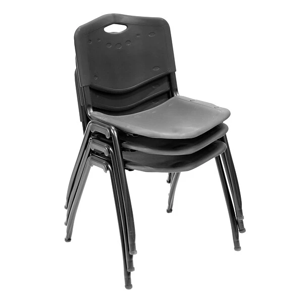 Give everyone more room with Kee tables. Kee post legs come four to a set and include adjustable leveling glides so you have a steady table with no wobble. This versatile table and chair set includes one 66-inch long Kee training table with black post legs and two Black “M” Stack Chairs. The table is constructed of a thermal fused melamine Cherry laminate tabletop that is 1-inch thick and finished with a black T-Mold edge band. Laminates are scratch, stain and scald resistant and wipe clean easily. Rounded corners make the table safer for everyone. A sleek alternative to pedestal style bases, this set of post legs comes in a classic black to match any decor. The legs are constructed of tubular steel with adjustable glides on the bottom of the base. The sturdy, lightweight “M” stack chair by Regency offers durability, style and value. Its black metal frame and contoured plastic seat and back are strong and easy to clean. This versatile stack chair easily stores away in stacks of 12 and features a built in handle for easy mobility. All Regency chairs are backed by a 5-year limited manufacturer’s warranty on chair bases and frames and a 2-year limited manufacturer’s warranty on chair mechanisms and upholstery. Kee tables are backed by a 10-year limited manufacturer’s warranty.