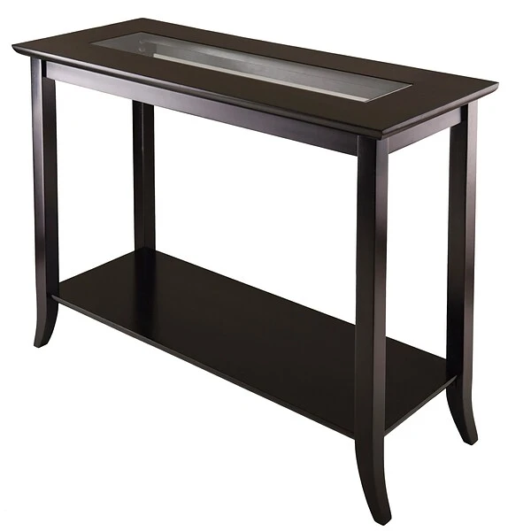 Give any room an elegant, professional feel with the Winsome Genoa wood console table. Its rectangular shape makes it perfect for rooms where you want to conserve space, the heat resistant, tempered glass top adds to the elegant look and makes the room feel open, and the bottom shelf provides storage space.