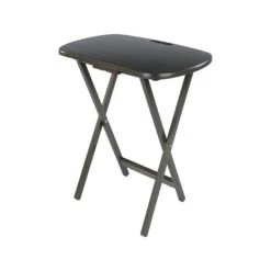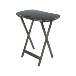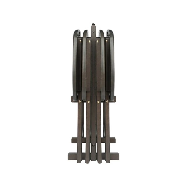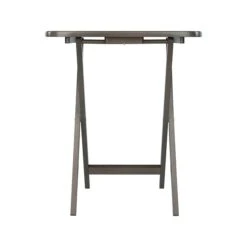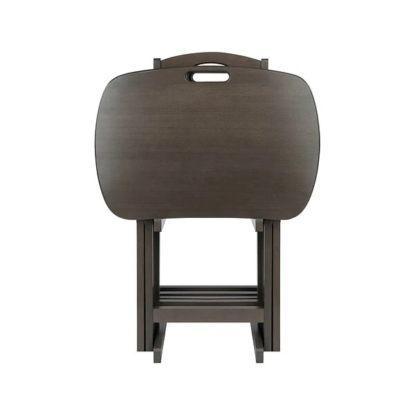 Enjoy a casual meal at home in style with the Lucca TV table set. The rounded oblong shape of the folding tables is handsomely designed with cutout handles for easy portability. The tables stow neatly onto the notches in the stand to keep them securely in place when not in use. Made of solid wood in a contemporary oyster gray finish.