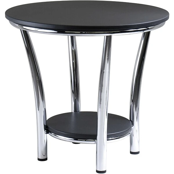 Winsome Maya round end table has elegant black metal finish top to keep personnel collection. Lower shelf is used to store books and magazines. Table is made of metal and MDF for longer durability.